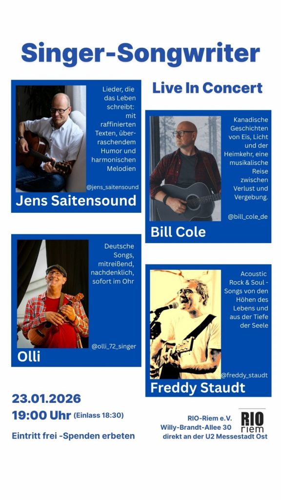 Vier außergewöhnliche Singer-Songwriter teilen sich am 23. Januar im Saal des RIO-Riem e.V.  eine Bühne – jeder mit unverwechselbarem Klang, eigener Handschrift und einer gemeinsamen Leidenschaft für Geschichten, Gefühl und Musik. Bill Cole öffnet mit seinen kanadisch geprägten Bildern von Eis, Licht und Heimkehr eine poetische Welt zwischen Verlust und Vergebung. Olli berührt mit deutschsprachigen
