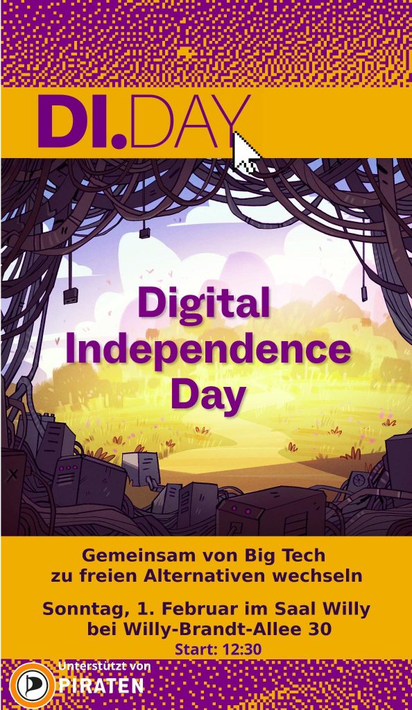 Beim Digital Independence Day (mit Unterstützung der Piraten) geht es darum, sich auf seinen Geräten (Computer, Tablet, Smartie) unabhängig zu machen von den US “Big Tech” Firmen: Google, Microsoft, Apple etc.. Dabei werden folgende Themen im Fokus stehen: Von Windows zu Linux Von Whatsapp zu Signal Von X zu Mastodon Es wird hierzu einen Vortrag