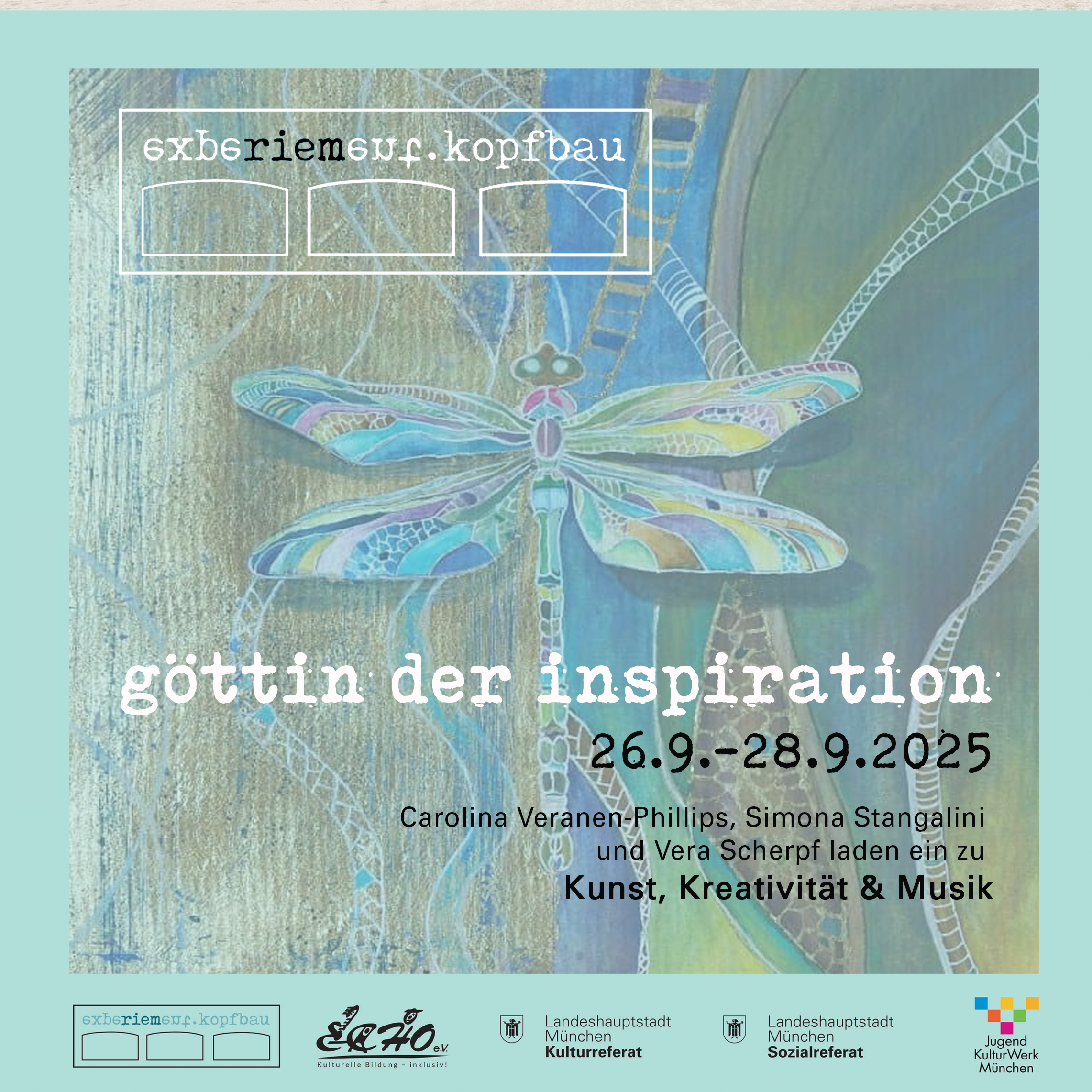 Ein Wochenende voller kreativer Inspirationen erwartet die Besucher des Kopfbaus von Freitag, 26.9. bis Sonntag, 28.9.25: Die internationale Mixed-Media Künstlerin und Autorin Carolina Veranen-Phillips lädt ein zu ihrem Programm „Göttin der Inspiration“. Gemeinsam mit den Künstlerinnen Simona Stangalini und Vera Scherpf präsentiert sie einen bunten Mix aus Kunstwerken, kreativen Workshops für Kinder und Erwachsene und diverse Musik-Events. Für die Workshops ist eine Anmeldung nötig, die Ausstellung, die Musik-Events und das Café im Kopfbau sind zu den Veranstaltungszeiten für jedermann geöffnet. Im Café wird feine Kulinarik aus Kalabrien serviert: das Team von Luisa Nigro & Francesco Candreva verwöhnt die Gäste mit Espresso, Wein und italienischen Spezialitäten. Der Event beginnt am Freitag, 26.9. um 18 Uhr mit einer Vernissage und geht das ganze Wochenende über bis zum Sonntag um 15 Uhr. Nähere Infos gibt es unter www.kopfbau-riem.de