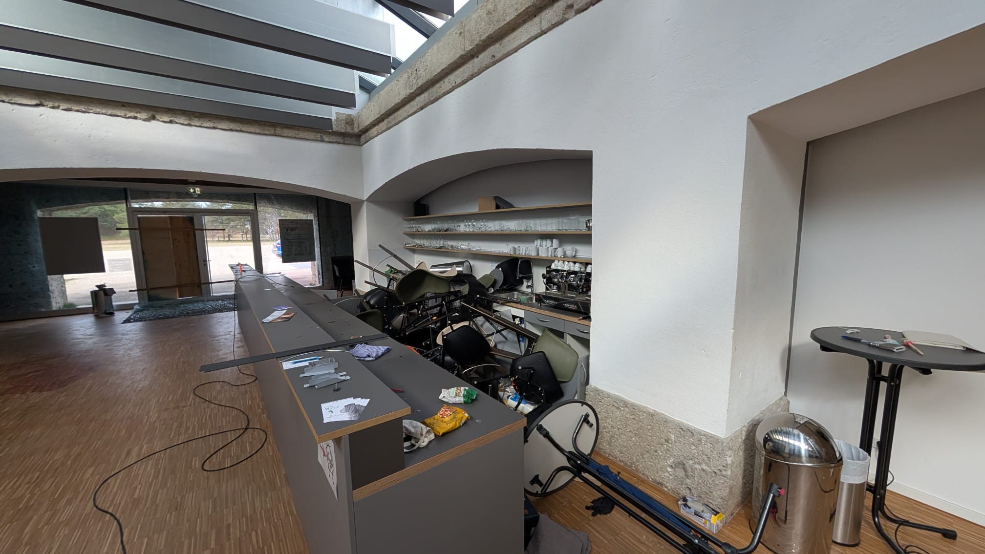 Dabei wurde eine Glastür eingeschlagen. Im Innern wurden der Café- und der Technikbereich verwüstet, sowie Wände und Boden mit Farbe besprüht. Vor Ort wurden umgehend durch die Kriminalpolizei umfangreiche Spurensicherungsmaßnahmen durchgeführt, ein Hubschrauber war in die Tätersuche involviert. Es handelt sich nach momentanem Stand der Ermittlungen höchstwahrscheinlich um drei männliche jugendliche Täter im Alter von ca. 16 Jahren. Der Gesamtschaden wird auf mehrerer tausend Euro geschätzt. Die weiteren Ermittlungen werden vom Kommissariat 13 geführt.