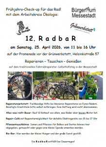 Der Arbeitskreis Ökologie des Bürgerforums Messestadt veranstaltet wieder seinen traditionellen Radl-Reparatur-Selbsthilfetag. Es gibt eine Rad-Reparaturwerkstatt mit fachkundiger Hilfe bei kleineren Reparaturen, benötigte Ersatzteile sollen dafür mitgebracht werden. Beim „Alles-was-rollt-Basar“ kann alles, was Räder (ohne Motor!) hat, gekauft und verkauft werden. Bei der Pflanzentauschbörse können Samen und Pflanzen für Balkon und Garten getauscht oder gegen eine kleine Spende erworben werden. Und natürlich gibt es auch etwas für den kleinen Hunger oder Durst in der Bio-Bar! Der Aktionstag „RadbaR“ findet statt am Samstag, 25.4.26 von 11 Uhr bis 16 Uhr vor der Grünwerkstatt, Helsinkistr. 57, 81829 München. Eine Anmeldung ist nicht nötig, der Besuch ist kostenlos! Es lohnt sich also auf jeden Fall vorbeizuschauen. Bei schlechtem Wetter müssen die Angebote im Freien leider entfallen.